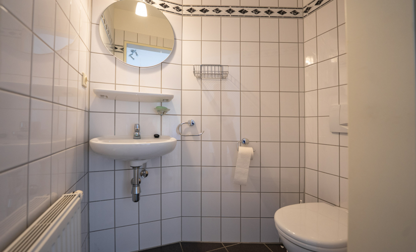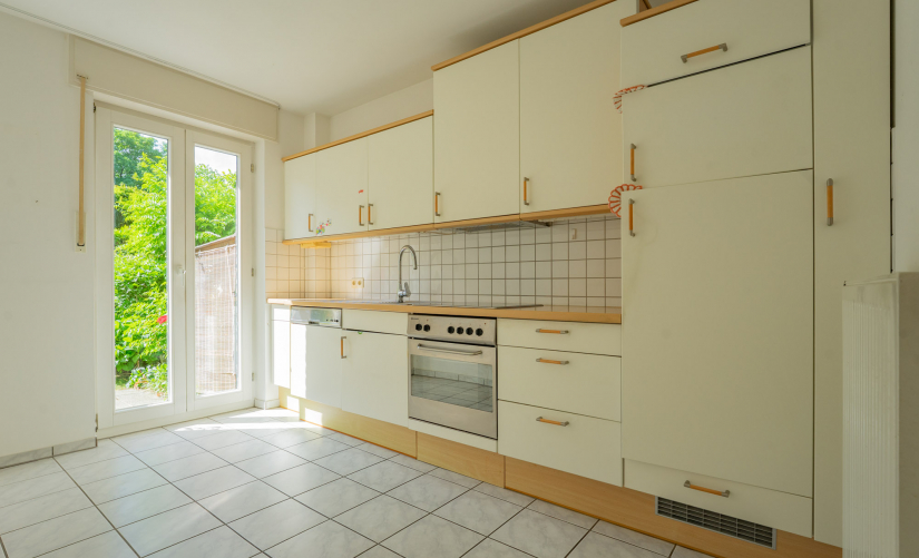 Direkt im Anschluss liegt die Küche, auch mit Fenstertür und Ausgang in den Garten. Weiter gibt es eine weitläufige Eingangsdiele, ein modernes Gäste-WC, einen Abstellraum, ein helles und weiß gefliestes Bad mit bodentiefem Tageslichtfenster, ein Kinder-/Arbeitszimmer und ein ca. 18m² großes Schlafzimmer mit Ankleidebereich.