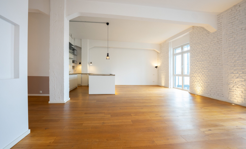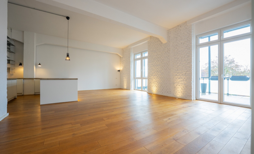 Mit rund 132 m² Wohnfläche verbindet dieses Loft Großzügigkeit mit einem eindrucksvollen Raumgefühl. Hohe Räume, sichtbare Betonkonstruktionen, verklinkerte Wände und breite Holzdielen schaffen ein Ambiente, das industriellen Charme mit moderner Wohnqualität vereint.