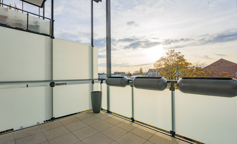 Vom Wohnbereich aus gelangt man auf den etwa 10 m² großen Balkon, der ideale Bedingungen für eine stilvolle Outdoor-Lounge, Pflanzenarrangements oder stimmungsvolle Beleuchtung bietet. Ein Platz, der gleichermaßen Ruhepunkt wie Treffpunkt sein kann.