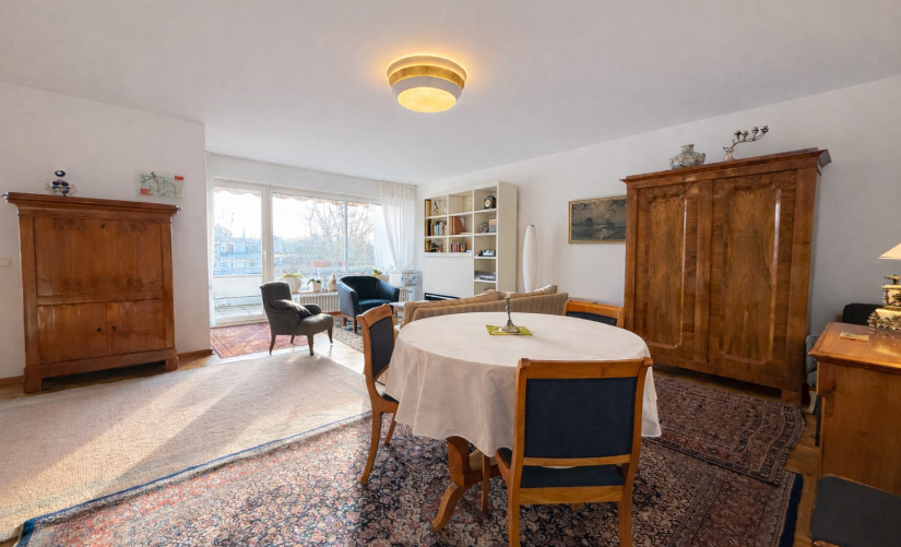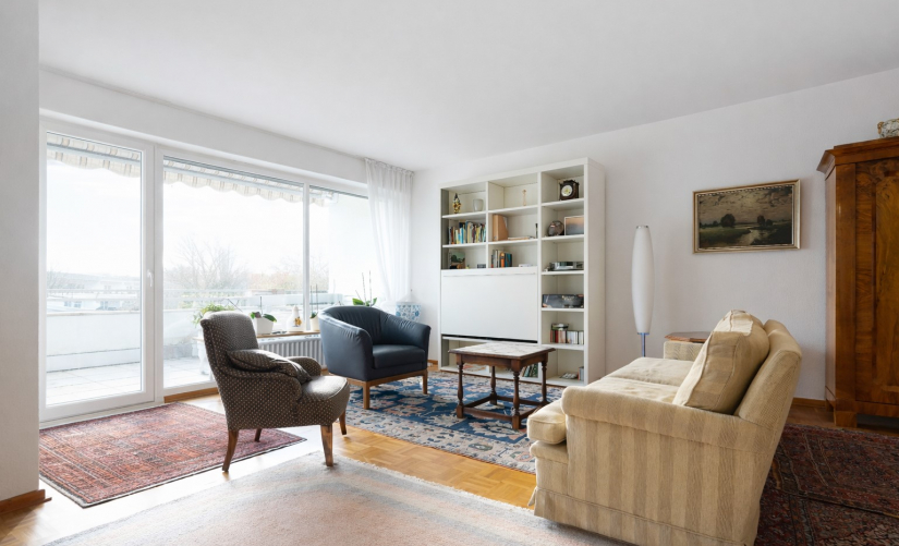 In der Wohnung angekommen, werden Sie sich sicherlich auf Anhieb wohlfühlen. Insgesamt rund 107 m² Wohnfläche verteilen sich großzügig auf 2,5 Zimmer. Besonders hervorzuheben ist der geräumige, lichtdurchflutete Wohn-/Essbereich mit großen Fensterfronten und hübschem Ausblick. Hier trennt sich gekonnt ein kleines Arbeits/-Gästezimmer mit moderner Glas-Schiebetür ab. Der sonnige Hauptbalkon ist vom Wohnbereich aus zugänglich und bietet insbesondere in den wärmeren Monaten eine echte Erweiterung des Wohnraums – ideal zum Entspannen oder für gesellige Stunden im Freien.