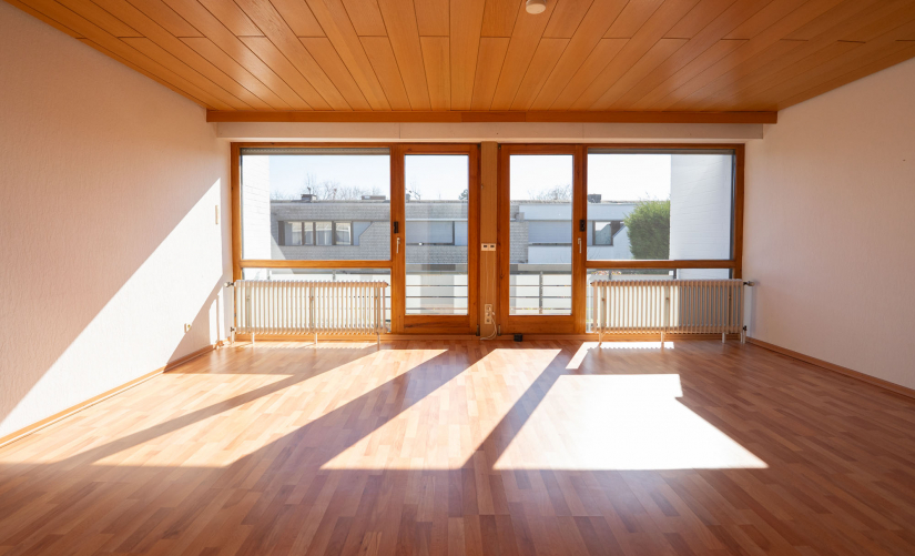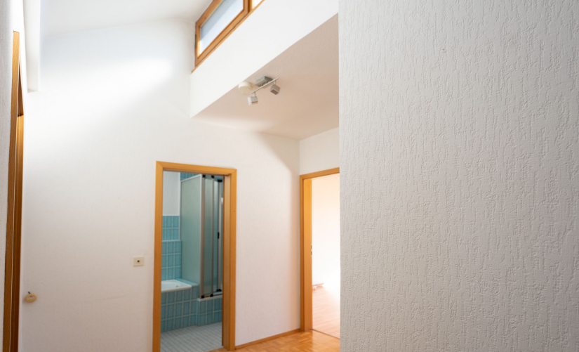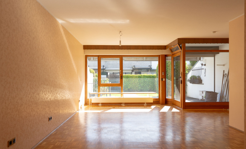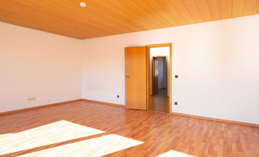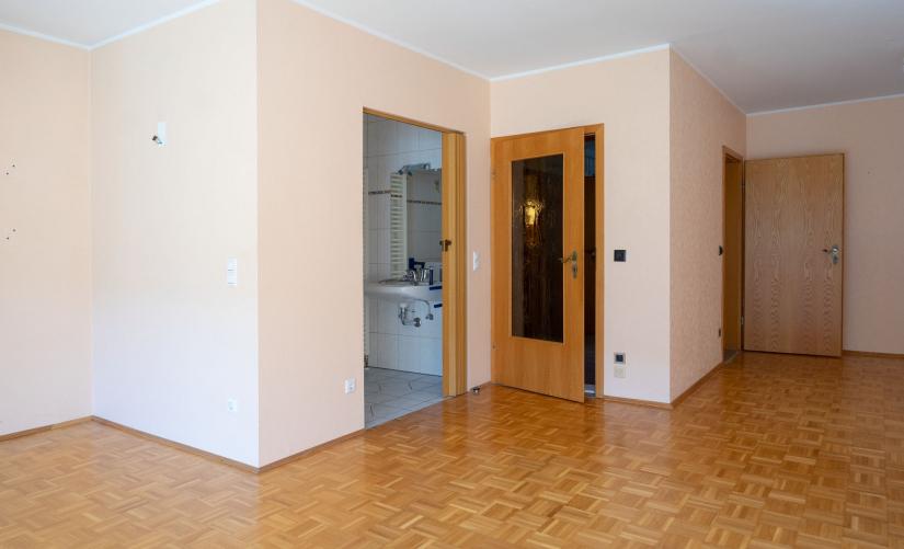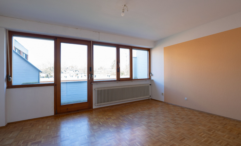 Info: Im Wohnzimmer befindet sich derzeit ein durch Leichtbauwände eingezogenes Badezimmer, welches Sie auf den Fotos irritieren könnte. Dieses ist ohne größeren Aufwand zurückzubauen.