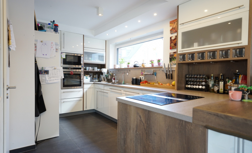 Bereits beim Betreten des Erdgeschosses eröffnet sich ein beeindruckendes Wohnkonzept: der lichtdurchflutete Wohn- und Essbereich mit bodentiefen Fensterfronten schafft eine einladende Atmosphäre und verbindet den Innen- mit dem Außenbereich. Der stilvolle Kaminofen setzt einen behaglichen Akzent und sorgt für eine warme, wohnliche Stimmung. Die offen gestaltete Küche ist ein wahres Paradies für Hobbyköche und Familien gleichermaßen – hochwertig ausgestattet, komfortabel geschnitten und perfekt in das Wohnkonzept integriert. Die angrenzende Terrasse mit sonniger Ausrichtung lädt zum Entspannen ein, während der Garten vielfältige Gestaltungsmöglichkeiten bietet. Ein Gäste-WC im Erdgeschoss ist selbstverständlich auch vorhanden.