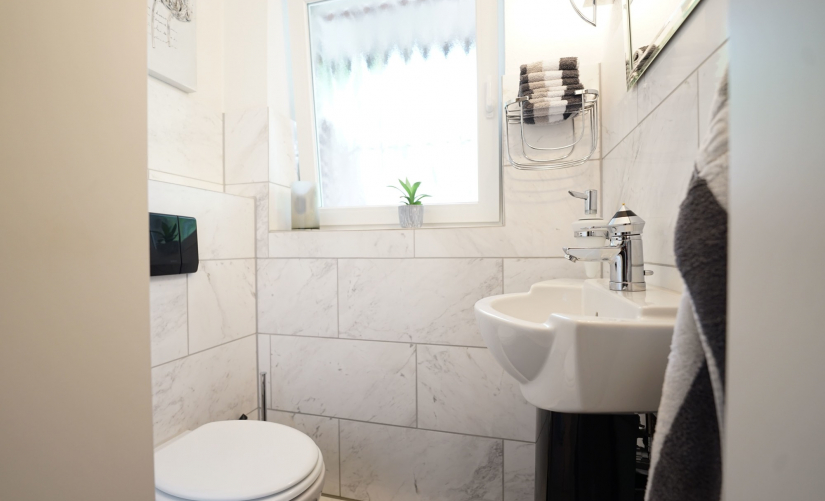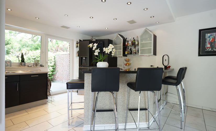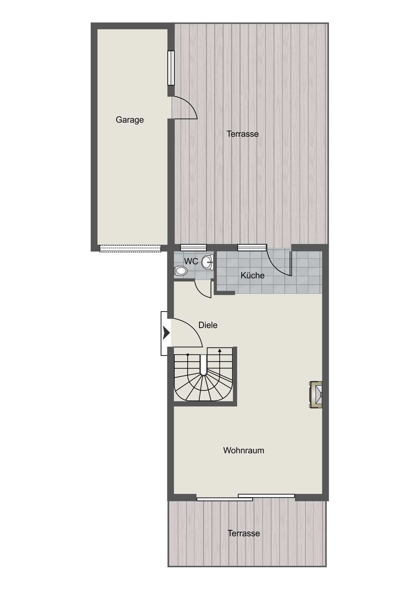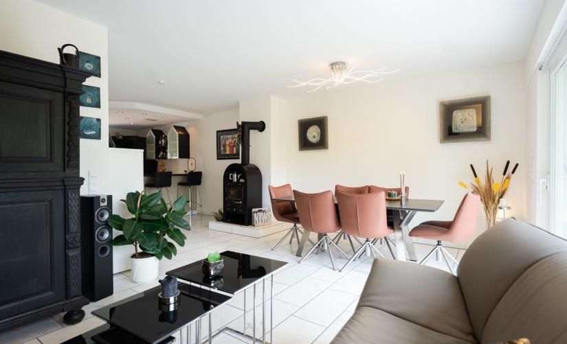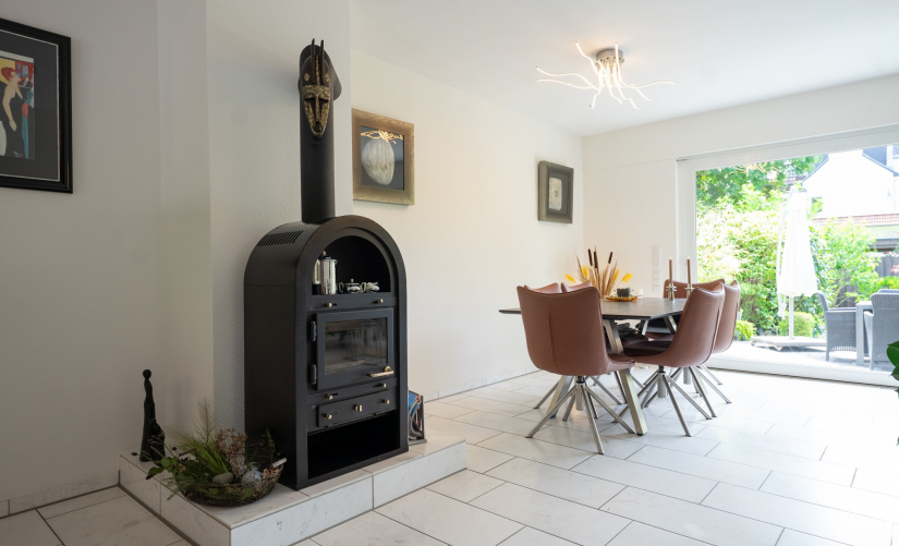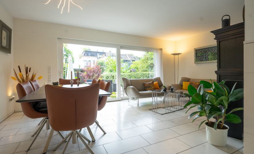 Das Erdgeschoss bildet das Herzstück des Hauses: ein großzügiger, offen gestalteter Wohn- und Essbereich mit bodentiefen Fensterfronten bietet direkten Zugang zur Südwest-Terrasse und in den Garten. Ein gemütlicher Kaminofen sorgt im Winter für wohlige Wärme und eine behagliche Atmosphäre. Die offene Küche mit Zugang zur morgendlichen Sonnenterrasse fügt sich nahtlos in das Raumkonzept ein – kommunikativ, modern und funktional. Ein Gäste-WC rundet die Erdgeschoss-Ebene perfekt ab.