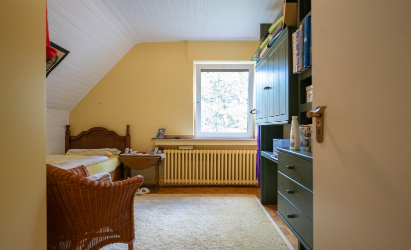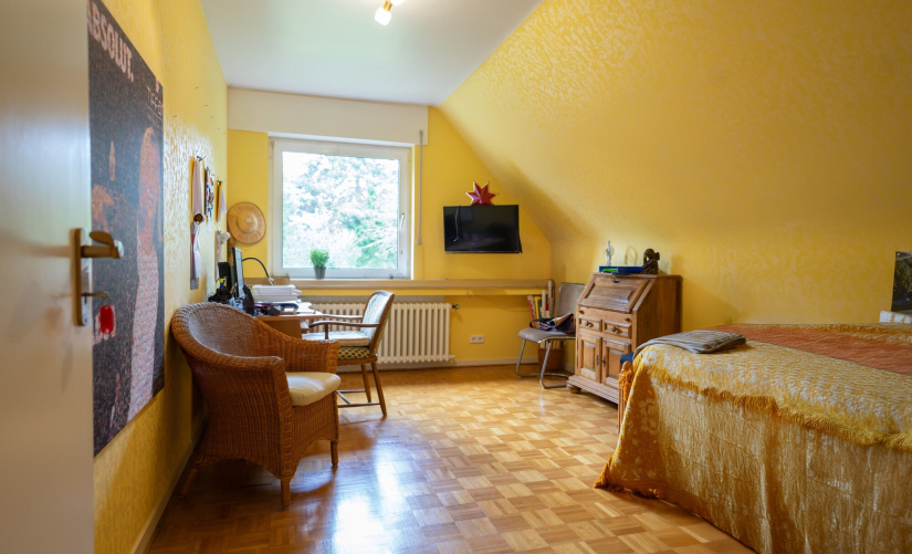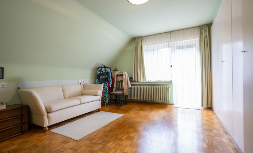 Im Obergeschoss stehen drei gut geschnittene Schlafzimmer zur Verfügung, eines davon mit eigenem Balkon und Blick in den Garten. Zwei Badezimmer aus dem Baujahr komplettieren die Schlafetage und bieten Komfort für die ganze Familie.