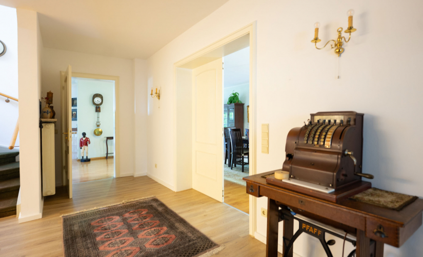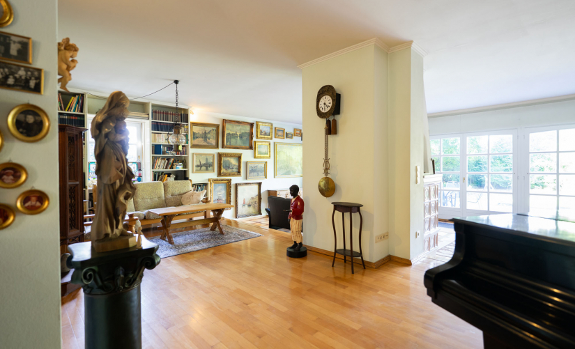 Die Wohnfläche beträgt insgesamt ca. 400 m² und verteilt sich auf das Erdgeschoss, das 1. Obergeschoss und das Dachgeschoss. Bereits der Eintritt in diese Ausnahme-Immobilie zeigt, was an Großzügigkeit auf Sie zukommt: Ein überaus einladendes Entrée mit Blick auf das schöne Treppenhaus heißt Sie herzlich willkommen! Mit einem über 100 m² großen Wohn-/Essbereich mit schönem Ausblick in den Garten, welcher durch ein paar Treppenstufen eine zusätzliche Gliederung erfährt, überzeugt das Erdgeschoss und bietet mit dem offenen Kamin im unteren Wohnbereich sicherlich besondere Gestaltungsmöglichkeiten!