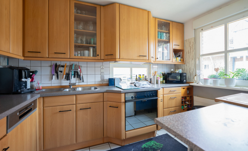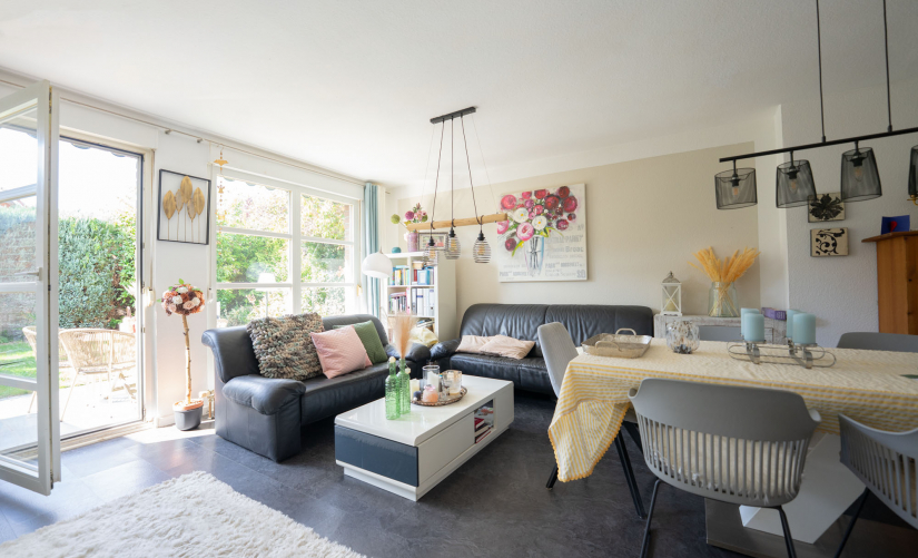 Zeitlos und klassisch gut aufgeteilt, stellt das Erdgeschoss die "Familien-Etage" dar. Der geräumige Wohn-/Essbereich bietet Ihnen ausreichend Platz für Ihre persönlichen Gestaltungsideen. Die hausbreiten, bodentiefen Sprossen-Fenster sorgen für viel Tageslicht und einen schönen Blick in den Sonnen-Garten! Die derzeit separierte Küche könnte bei Bedarf auch zum Wohnzimmer hin geöffnet werden. Sie bevorzugen ein offenes Raumkonzept? Hier ist es möglich - entscheiden Sie selbst! Ein weißes Gäste-WC mit Dusche rundet die Erdgeschoss-Etage ideal ab.
