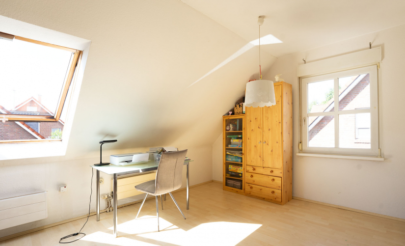 Das ausgebaute Dachgeschoss bietet Ihnen mit einem großen Raum Platz für ein schönes Arbeitszimmer und/oder ein weiteres Kinderzimmer. Durch das Velux-Dachfenster und das Fenster zur Giebelseite ist es hier ebenfalls sehr hell und freundlich. Im Kellerbereich gibt es ausreichend Stauraum sowie ein großes Hobby-Zimmer, das Ihnen eventuell als Home-Office dienen könnte.