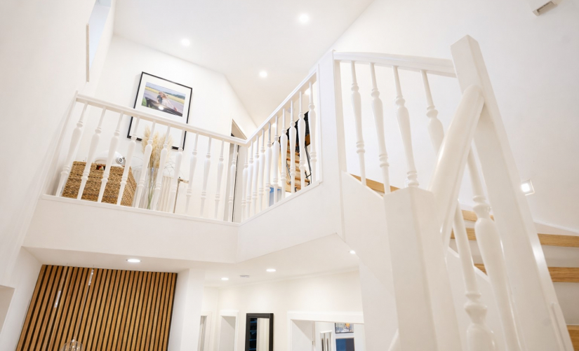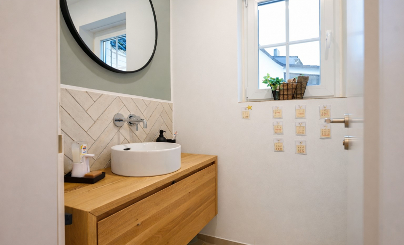 Im Obergeschoss befinden sich drei Schlafzimmer sowie zwei hochwertig ausgestattete Bäder, darunter ein Elternbad en Suite. Die Bäder überzeugen durch bodengleiche Duschen, das Elternbad zusätzlich mit Wanne, schwebende Sanitärobjekte, maßgefertigte Waschtische und eine minimalistische, zeitlos elegante Gestaltung.