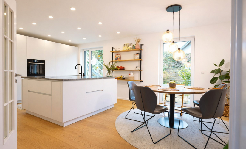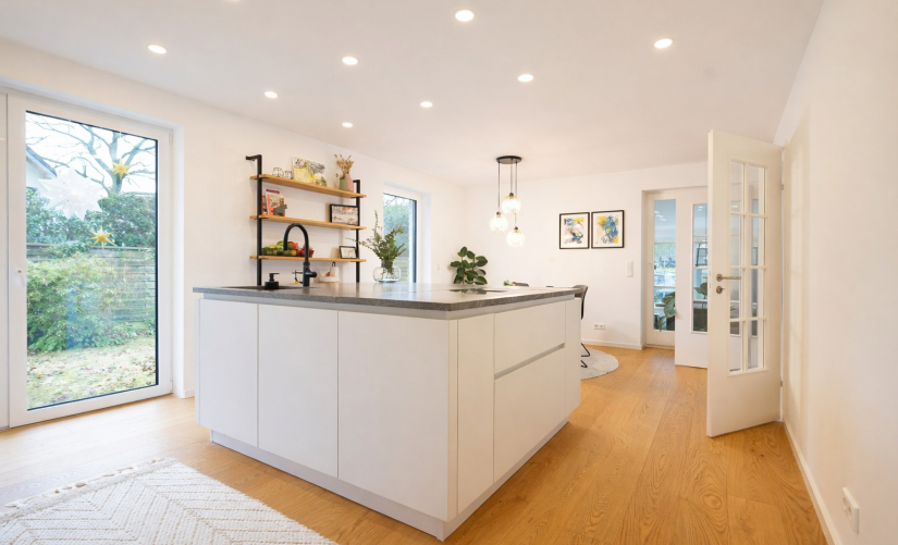 Der offene Wohn- und Essbereich mit offenem Kamin bildet das Herzstück des Hauses und verbindet sich direkt mit dem beheizten Wintergarten und den Terrassen. Der Kamin ist bündig in den Parkettboden integriert, ebenso wie die Medien- und Lichttechnik dezent und unsichtbar ausgeführt wurde. Die exklusive Designküche des Premiumherstellers Leicht mit Berbel- und Bosch-Geräten und einer außergewöhnlichen, nahezu quadratischen Rhyolith-Natursteinplatte bildet ein architektonisches Highlight und Mittelpunkt des Wohnens.