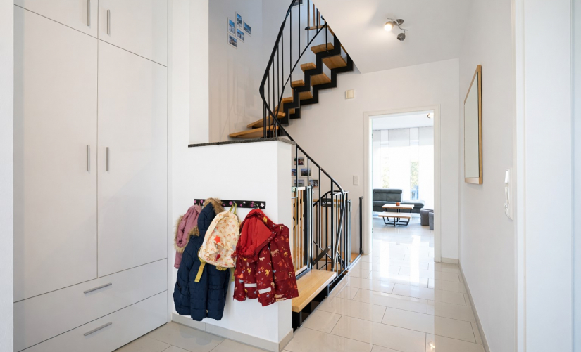 In solider Massivbauweise mit weißer Wanne errichtet, überzeugt das Haus auch technisch durch Qualität und Nachhaltigkeit. Das Erdgeschoss bietet neben dem großzügigen Wohnbereich eine geräumige Eingangsdiele mit praktischen Einbauschränken sowie ein modernes Gäste-WC. Im Obergeschoss erwarten Sie drei gut geschnittene Schlafzimmer und ein stilvolles Tageslichtbad mit bodengleicher Dusche und Badewanne – zeitlos gestaltet und komfortabel ausgestattet.