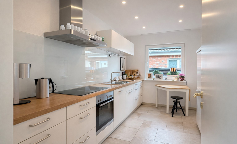 Der separate Küchenbereich überzeugt mit einer hochwertigen Einbauküche von Nolte, die bereits im Kaufpreis enthalten ist.