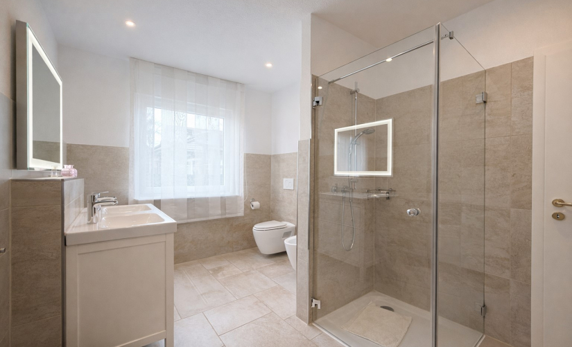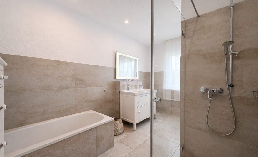 - zeitlos elegantes Tageslichtbad mit bodentiefer Dusche und Wanne