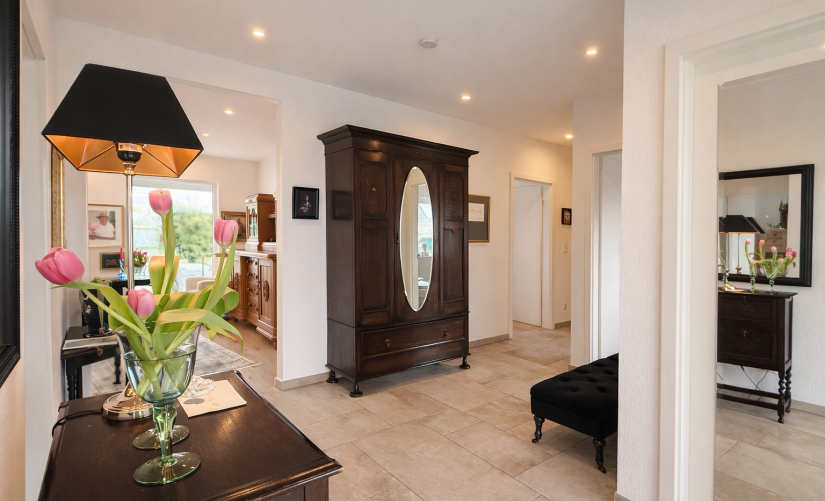 Ein weitläufiger Eingangsbereich empfängt Sie hell und freundlich. Herzstück des Hauses ist der großzügige Wohn- und Essbereich mit zahlreichen bodentiefen Fensterelementen, die für eine lichtdurchflutete Atmosphäre sorgen und den direkten Zugang zur Sonnenterrasse sowie in den liebevoll angelegten Garten ermöglichen.