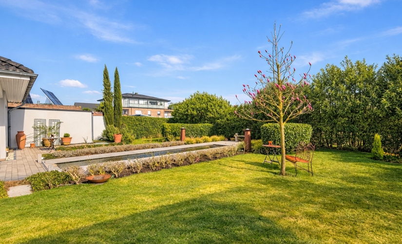 Der stilvoll angelegte Garten bildet ein weiteres Highlight der Immobilie. Er überzeugt durch klare Linien und eine hochwertige Gestaltung. Mittelpunkt ist das elegant eingefasste, rechteckige Wasserbecken, das dem Außenbereich eine besondere Ruhe und Eleganz verleiht. Großzügige Natursteinflächen unterstreichen die moderne, aufgeräumte Anmutung.