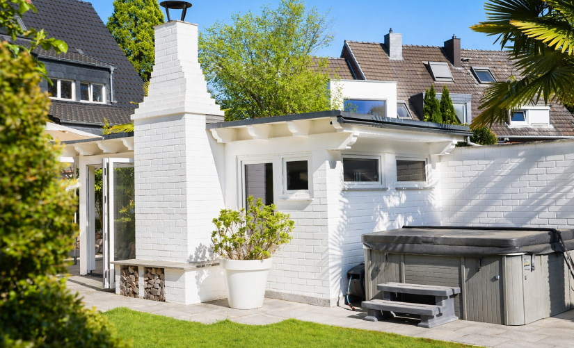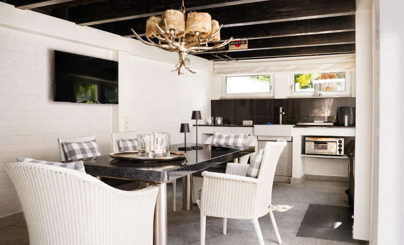- Gartenhaus mit Kaminofen und Outdoor-Küche
