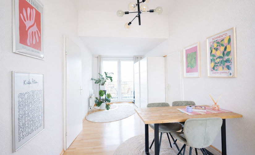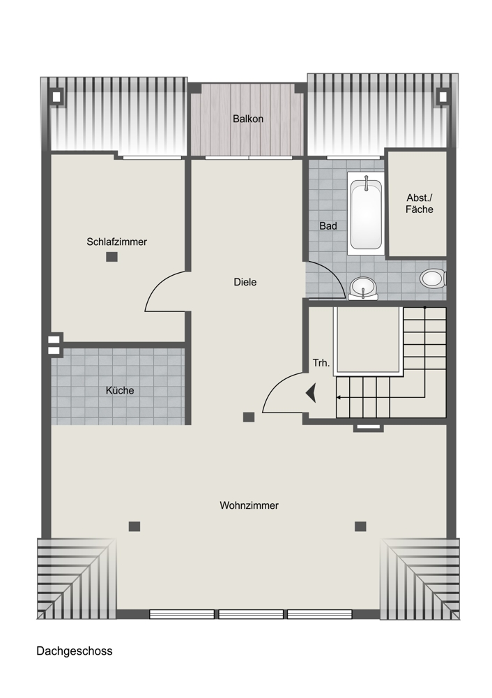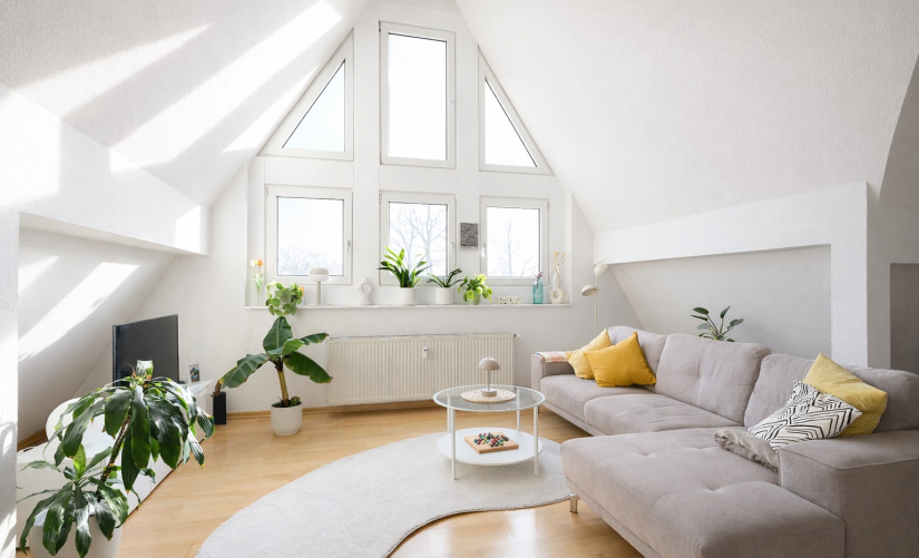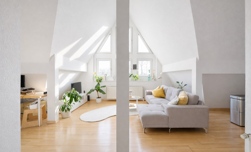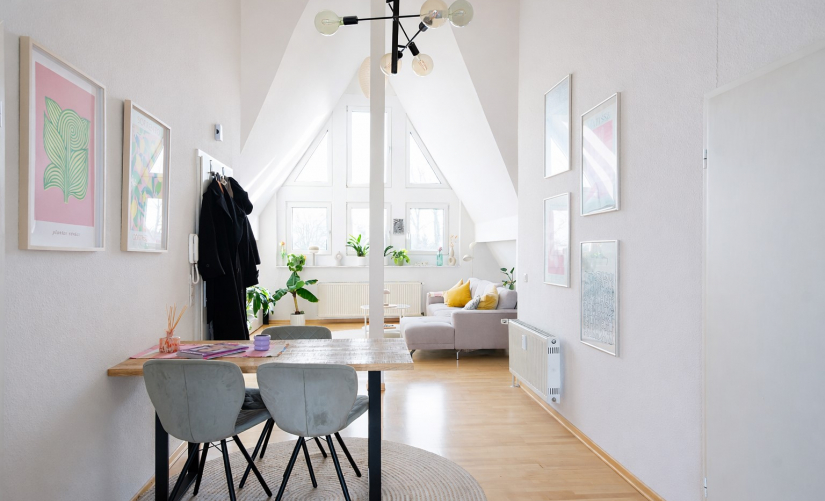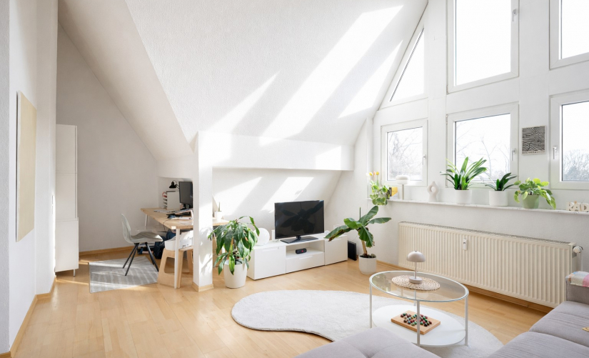 Der geöffnete Spitzboden verleiht dem Hauptbereich der Wohnung eine beeindruckende Raumhöhe. Beide Seiten der Wohnung lassen großzügigen Lichteinfall zu und schenken dem Wohn-, Ess- und Flurbereich mit knapp 47m² eine freundliche und positive Atmosphäre.