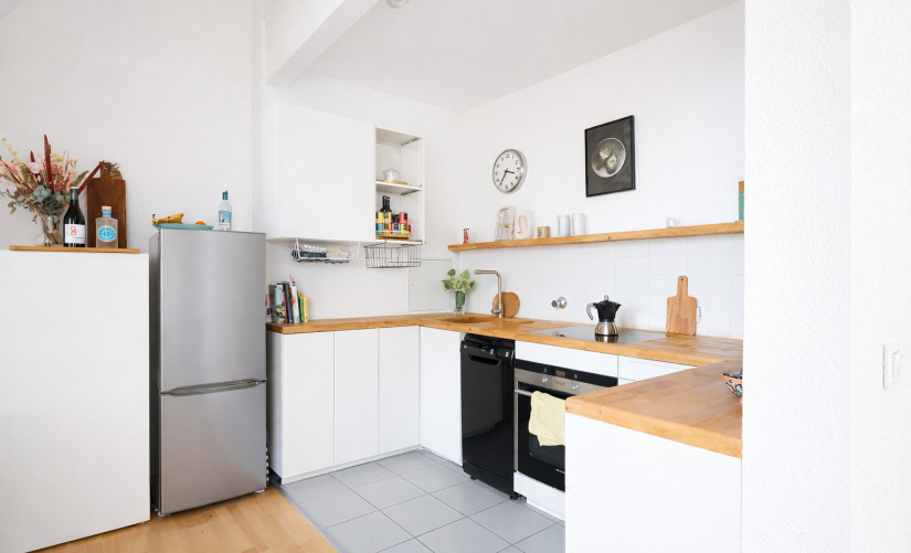 Etwas versteckt, liegt die zurück gebaute Kochnische, die verschiedenste Gestaltungsmöglichkeiten bietet. Eine Küche ist vom zukünftigen Mieter selbst mitzubringen. Gespiegelt auf der anderen Seite dann die Möglichkeit zur Einrichtung eines Arbeitsplatzes oder Fernsehecke für gemütliche Abende auf der Couch.