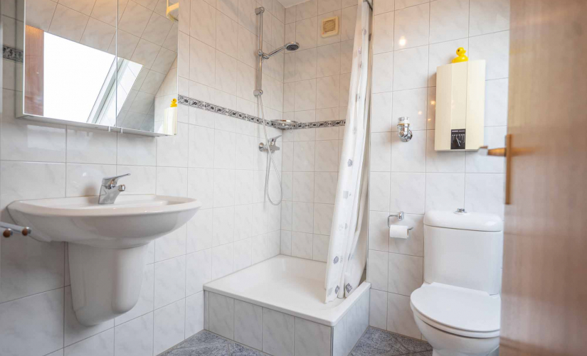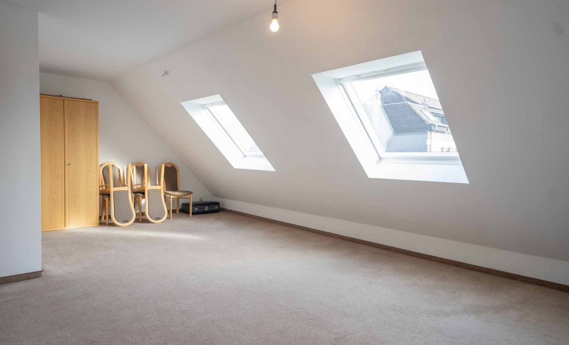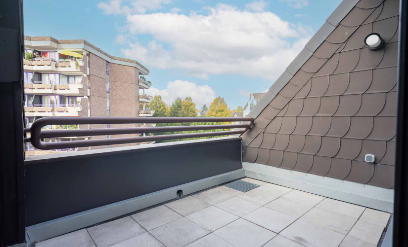 Über die klassische Wendeltreppe gelangen Sie in die obere Etage. Hier steht Ihnen ein weiterer, ebenfalls neu gestalteter, aber sehr kleiner Balkon, ein zweites Badezimmer mit Dusche und Tageslichtfenster und ein weiteres, äußerst großzügiges und helles Schlafzimmer mit zwei großen Velux-Fenstern zur Verfügung.