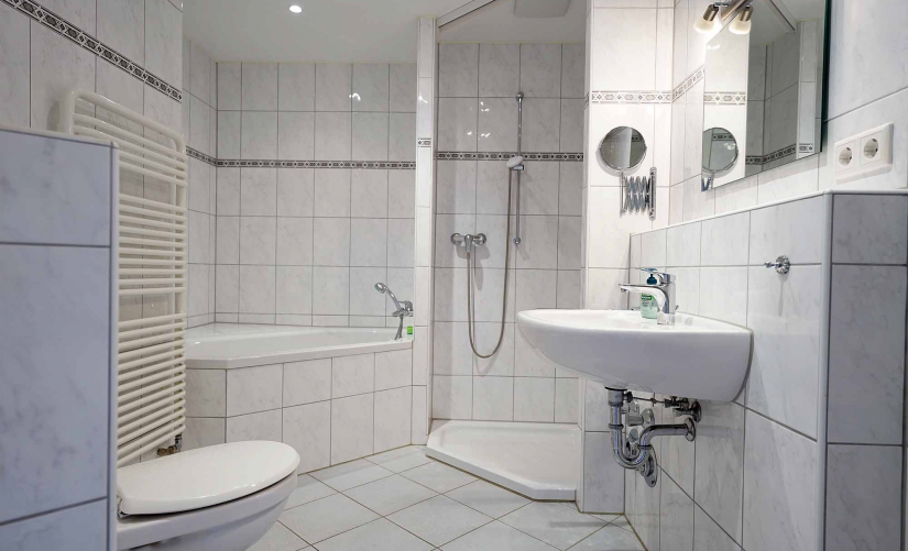 - Zeitloses Badezimmer mit Dusche und Badewanne