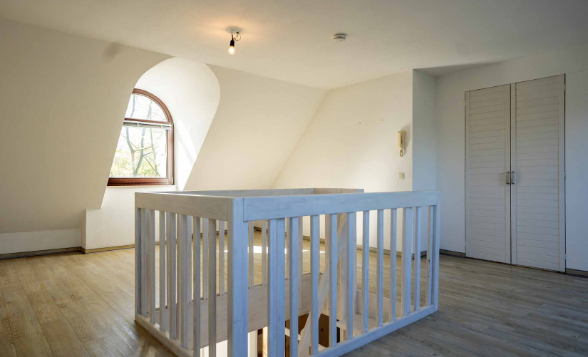 Auch die obere Etage ist dank zwei großen Velux-Fenstern und Rundgaube lichtdurchflutet. Ein richtig schöner und sehr geräumiger Schlafraum mit kleinem "begehbaren" Kleiderschrank.