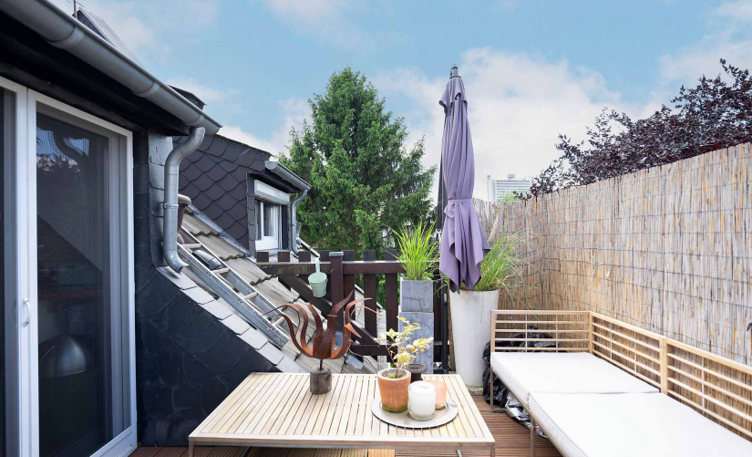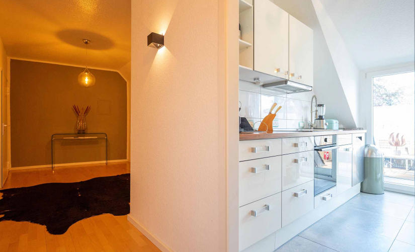 Der Küchenbereich ist bereits mit einer hochwertigen, im Kaufpreis enthaltenen, Einbauküche ausgestattet. Von hier haben Sie direkten Zugang auf die sehr schöne (Abend) Sonnen-Dachterrasse mit neu verlegtem Bangkirai. Der perfekte Platz, das Feierabend-Getränk entspannt genießen zu können!