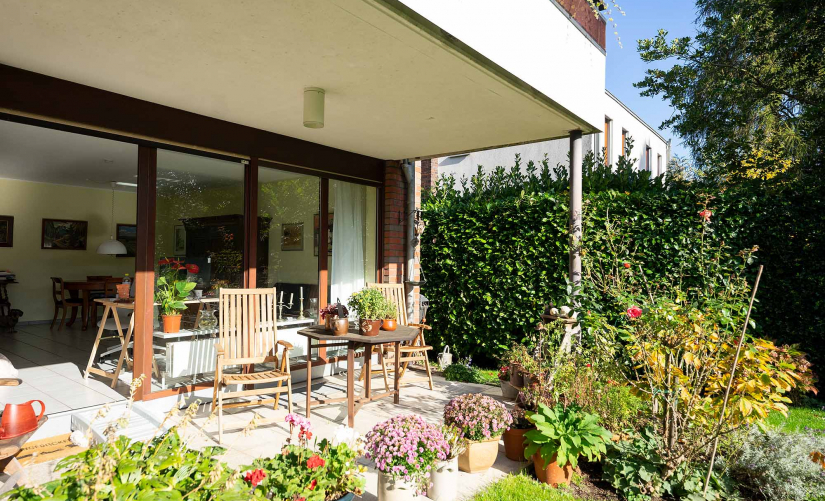 Das Herzstück der Wohnung bildet aber der geräumige Wohn-/Essbereich. Dank der großen, bodentiefen Fensterfront wird der Raum mit Licht durchflutet und bietet einen herrlichen Ausblick ins Grüne. Von hier aus gelangen Sie auf die großzügige, überdachte Sonnenterrasse, die durch ihre Privatsphäre besticht und zum Entspannen einlädt. Der angrenzende, eigene Gartenanteil ist wohl das absolute Highlight und rundet das Wohlfühlambiente ideal ab. Die Möglichkeit zum Kauf einer wertvollen, direkt hinter dem Haus gelegenen Einzelgarage macht das Gesamtpaket perfekt!