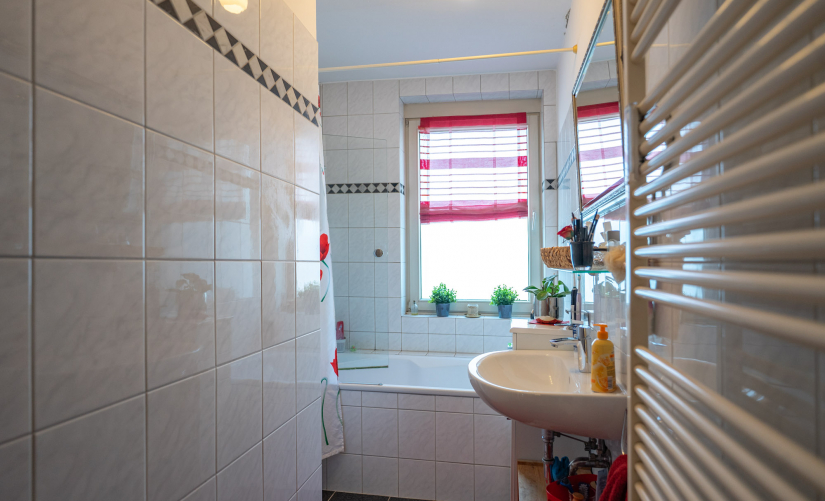 - weiß gefliestes Duschbad mit Tageslichtfenster