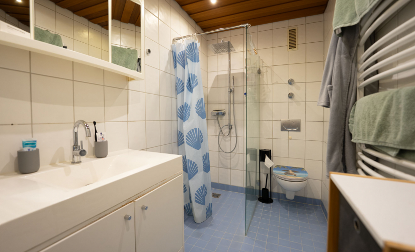 - Badezimmer guter Größe mit bodentiefer Dusche