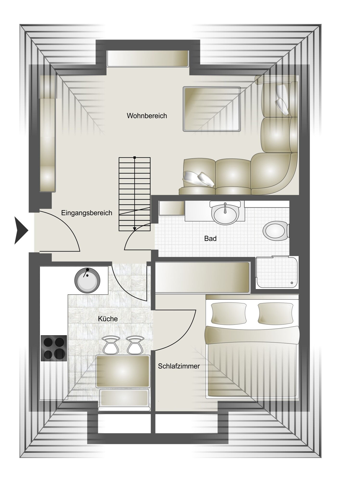 Über eine Treppe im Wohnbereich gelangen Sie in den Spitzboden, der seit Fertigstellung in 1972 mit zwei weiteren Einbau-Betten (140 x 200cm und 90 x 200cm) ausgestattet ist. Trotz der Einbauten handelt es sich hierbei lediglich um Nutz- und Hobbyfläche.