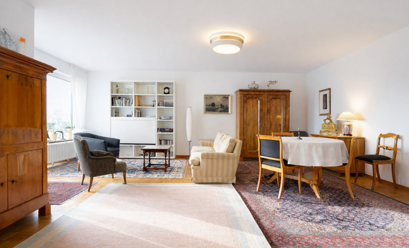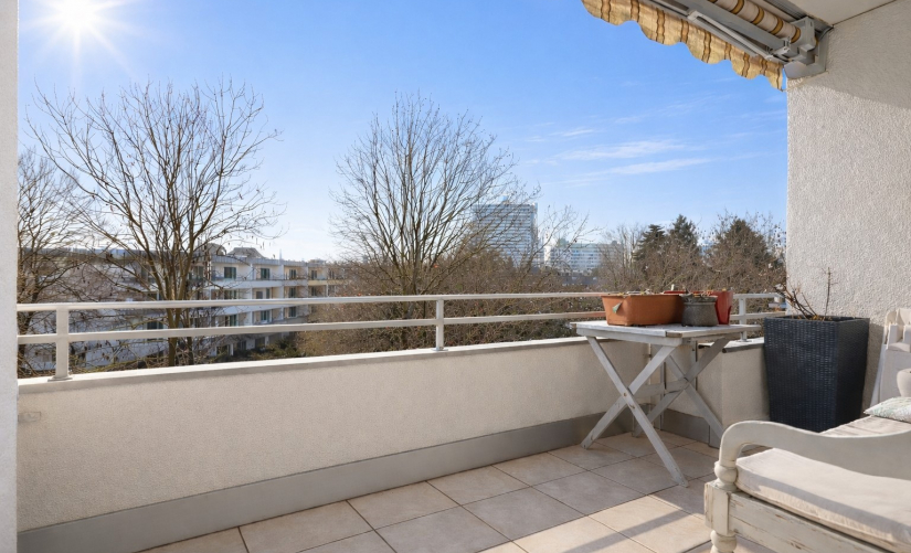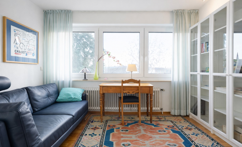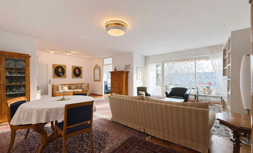 In der Wohnung angekommen, werden Sie sich sicherlich auf Anhieb wohlfühlen. Insgesamt rund 107 m² Wohnfläche verteilen sich großzügig auf 2,5 Zimmer. Besonders hervorzuheben ist der geräumige, lichtdurchflutete Wohn-/Essbereich mit großen Fensterfronten und hübschem Ausblick. Hier trennt sich gekonnt ein kleines Arbeits/-Gästezimmer mit moderner Glas-Schiebetür ab. Der sonnige Hauptbalkon ist vom Wohnbereich aus zugänglich und bietet insbesondere in den wärmeren Monaten eine echte Erweiterung des Wohnraums – ideal zum Entspannen oder für gesellige Stunden im Freien.