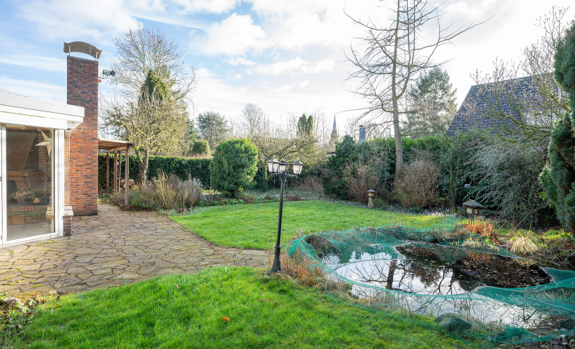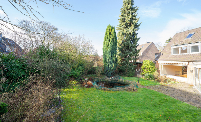 Das Erdgeschoss überzeugt insgesamt durch seinen geräumigen Wohn-/Essbereich mit einer Größe von rund 40m². Richtig schön ist hier der Blick durch die großen Fensterelemente in den großen Sonnengarten. Von hier aus gelangen Sie in den urig gemütlichen "Wintergarten" mit Panoramaverglasung und offenem Kamin. Der liebevoll angelegte Garten mit kleinem Teich wird in der sonnigen Jahreszeit gewiss zu Ihrer erweiterten Wohnfläche und bietet ausreichend Fläche für Grill- und Lounge-Ecke, Schaukel, Sandkasten und Co.!