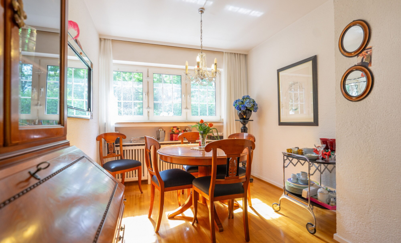 Auf insgesamt ca. 141 m² Wohnfläche empfängt Sie ein großzügiger Wohn- und Essbereich mit großen Fensterfronten, die den Blick in den weitläufigen Garten und auf die Terrasse freigeben. Der Garten selbst ist ein Paradies für Hobbygärtner und alle, die es noch werden wollen und bietet zahlreiche Möglichkeiten, die eigenen Ideen umzusetzen. Der bisher separate Küchenbereich ließe sich problemlos in den Wohnraum integrieren und könnte so zum neuen Mittelpunkt des Hauses werden – ein modernes, offenes Raumkonzept ist hier problemlos realisierbar. Ein kleines Gäste-WC mit Fenster rundet das Erdgeschoss ab.