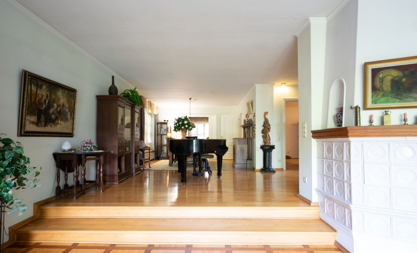 Die Wohnfläche beträgt insgesamt ca. 400 m² und verteilt sich auf das Erdgeschoss, das 1. Obergeschoss und das Dachgeschoss. Bereits der Eintritt in diese Ausnahme-Immobilie zeigt, was an Großzügigkeit auf Sie zukommt: Ein überaus einladendes Entrée mit Blick auf das schöne Treppenhaus heißt Sie herzlich willkommen! Mit einem über 100 m² großen Wohn-/Essbereich mit schönem Ausblick in den Garten, welcher durch ein paar Treppenstufen eine zusätzliche Gliederung erfährt, überzeugt das Erdgeschoss und bietet mit dem offenen Kamin im unteren Wohnbereich sicherlich besondere Gestaltungsmöglichkeiten!