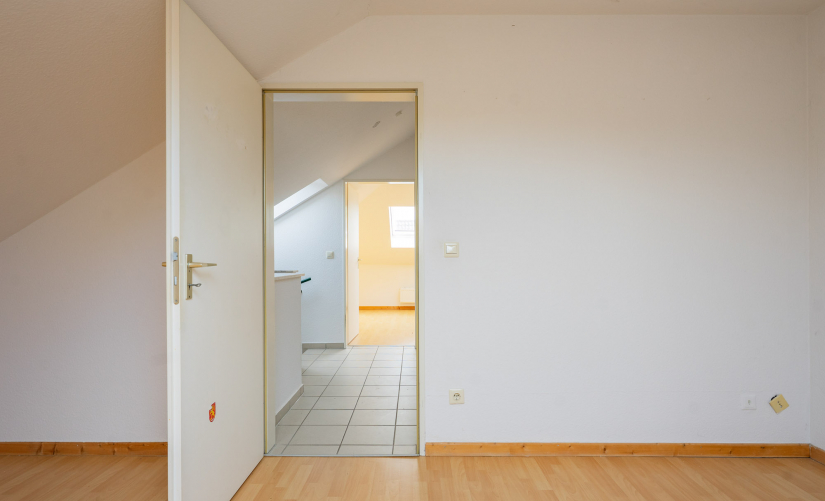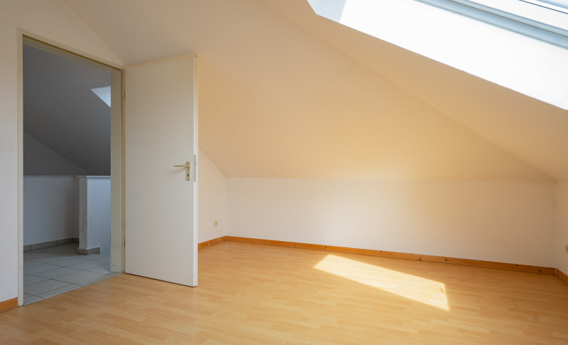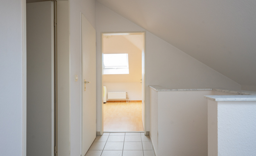 Im Obergeschoss befinden sich, dank der zwei Vollgeschosse, ebenfalls zwei geräumige Zimmer, wovon das eine zum Garten gelegen ist und sich perfekt als Schlafzimmer eignet. Das zweite Zimmer auf der anderen Seite der Etage stellt mit seinem Zugang zum Sonnenbalkon ein helles, lichtdurchflutetes Wohnzimmer dar. Ein klassisch weiß gehaltenes Badezimmer mit Badewanne rundet diese Etage ab. Über das helle Treppenhaus gelangen Sie in das großzügige Dachgeschoss, welches ebenfalls über zwei gleich große Zimmer guter Größe verfügt, beide einladend hell dank großer Dachflächenfenster. Ein zweites Bad, diesmal mit Dusche ausgestattet, ebenfalls klassisch weiß gefliest, rundet dieses interessante Immobilienangebot ab!