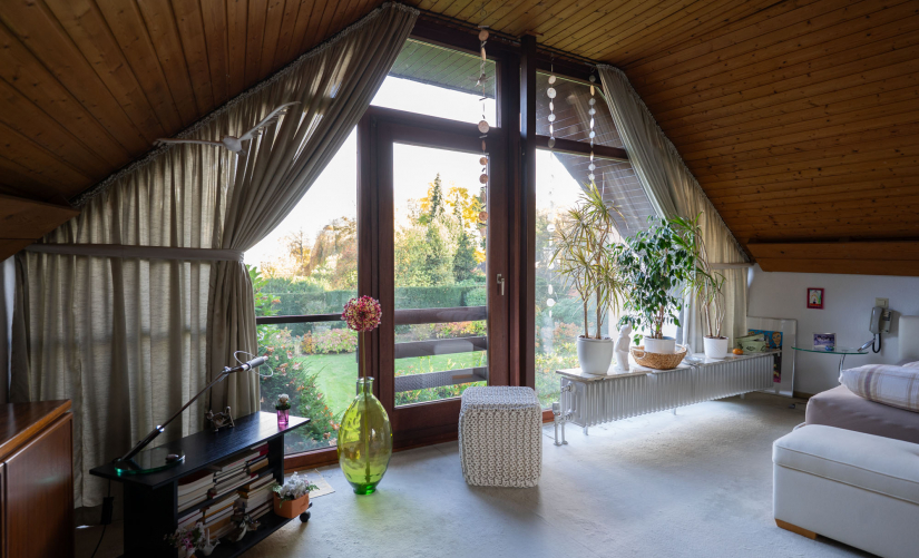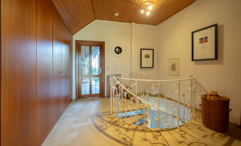 Über die einladende Wendeltreppe gelangen Sie in die private Etage mit zwei groß bemessenen Schlafzimmern. Das Hauptschlafzimmer liegt zur Gartenseite mit wunderschöner Aussicht in die umliegenden Gärten bis zum Stadtwald. Lichtdurchflutet dank der bodentiefen Fensterfront und hoher Decken bis zum First, lässt es sich hier hervorragend nächtigen! Der große Flur bietet mit einem maßgeschneiderten Einbauschrank viel Stauraum. Das zweite Schlafzimmer auf der gegenüberliegenden Seite könnte - wie ursprünglich geplant - geteilt werden. Ein Zugang über eine Türe im Flur würde zwei vollwertige Kinderzimmer entstehen lassen. Ein großes Tageslichtbad könnte nach einer Modernisierung Ihr neues Traum-Bad werden, es mangelt weder an Größe noch Licht. Sie sehen, diese Immobilie bietet vielfältige Nutzungsmöglichkeiten!