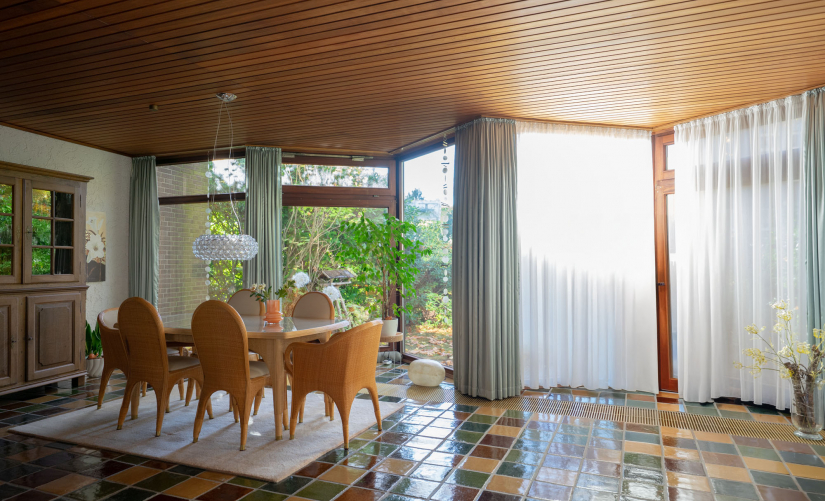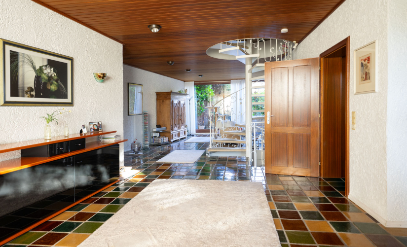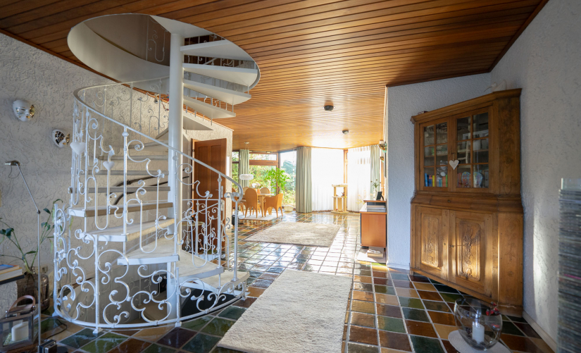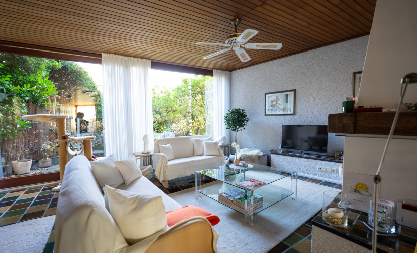 Mit einer Wohnfläche von ca. 164 m² wird der Grundriss dieser Immobilie, nach einer behutsamen Modernisierung, jetzigen Wohnanforderungen mehr als gerecht. Man betritt das Haus über einen hellen Flur mit Zugang zum separaten Gäste-WC. Von hier aus gelangt man in das Herzstück des Hauses, das überaus großzügige und offen gestaltete Wohn-/Esszimmer. Durch die gesamte bodentief gestaltete Fensterfront ist der Lichteinfall maximal! Eine bis jetzt noch halboffene Küche könnte geöffnet werden und den 70er-Jahre-Charme in die Moderne holen. Leicht unterteilt durch die individuelle Bauweise, gelangt man in das helle, zum Garten gelegene Wohnzimmer. Besondere Atmosphäre, vor allem in der kalten Jahreszeit, verbreitet der offene Kamin. Über eine bodentiefe Schiebetür betreten Sie die Terrasse mit Blick in den wunderschönen alten Gartenpark, ca. 308 m² Grundstücksanteil sind per Sondernutzungsrecht der Immobilie zugeordnet.