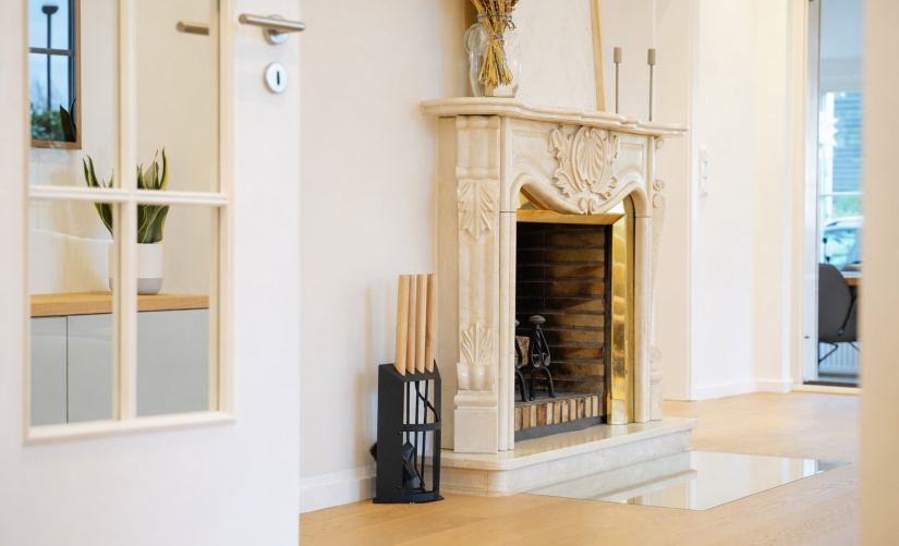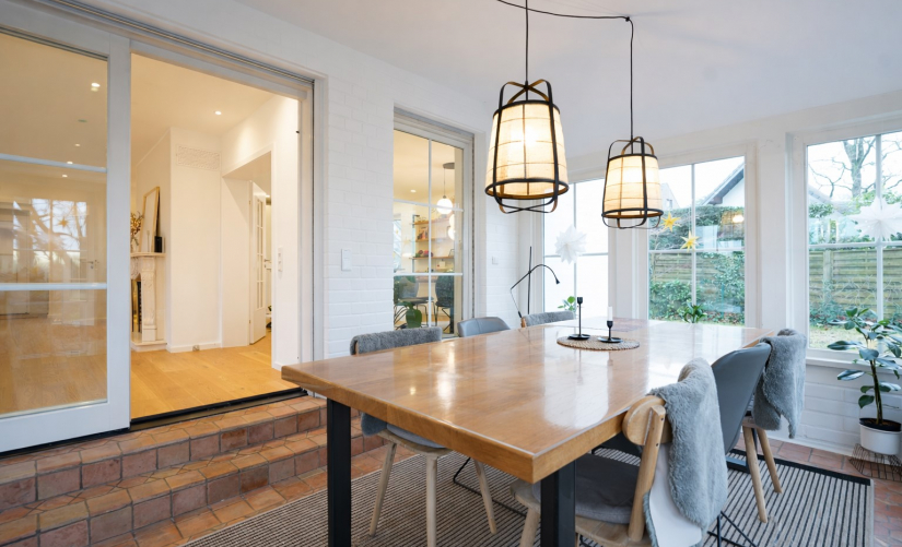 Der offene Wohn- und Essbereich mit offenem Kamin bildet das Herzstück des Hauses und verbindet sich direkt mit dem beheizten Wintergarten und den Terrassen. Der Kamin ist bündig in den Parkettboden integriert, ebenso wie die Medien- und Lichttechnik dezent und unsichtbar ausgeführt wurde. Die exklusive Designküche des Premiumherstellers Leicht mit Berbel- und Bosch-Geräten und einer außergewöhnlichen, nahezu quadratischen Rhyolith-Natursteinplatte bildet ein architektonisches Highlight und Mittelpunkt des Wohnens.