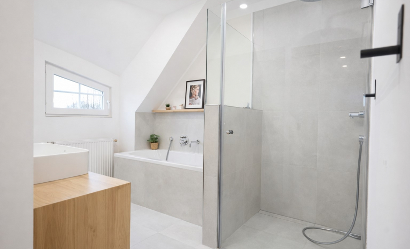 Im Obergeschoss befinden sich drei Schlafzimmer sowie zwei hochwertig ausgestattete Bäder, darunter ein Elternbad en Suite. Die Bäder überzeugen durch bodengleiche Duschen, das Elternbad zusätzlich mit Wanne, schwebende Sanitärobjekte, maßgefertigte Waschtische und eine minimalistische, zeitlos elegante Gestaltung.