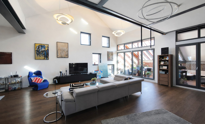 Heute präsentiert sich die Immobilie als beeindruckendes Einfamilien-Loft mit rund 231 m² Wohnfläche. Ein separater Hauseingang mit eigenem Treppenhaus führt direkt in den Wohnbereich und vermittelt vollständige Privatsphäre.