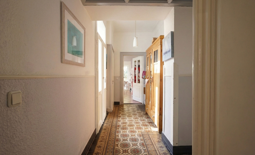 Beim Betreten des Hauses heißt Sie der großzügige Eingangsbereich willkommen. Hier vermittelt das original erhaltene Holztreppenhaus sofort ein Gefühl von Geborgenheit und Tradition. Die Altbau-typischen hohen Decken, der erhaltene Fliesenboden und die lichtdurchfluteten Räume schaffen eine unvergleichliche Atmosphäre, die modernes Wohnen und historischen Stil harmonisch vereint.
