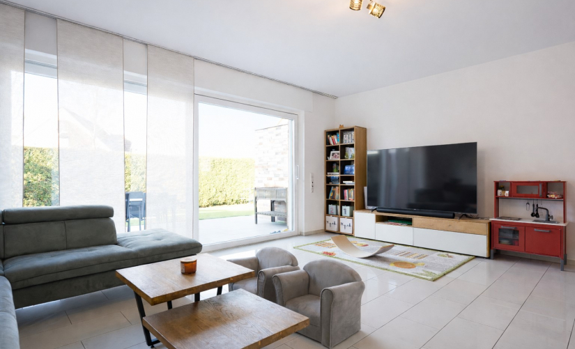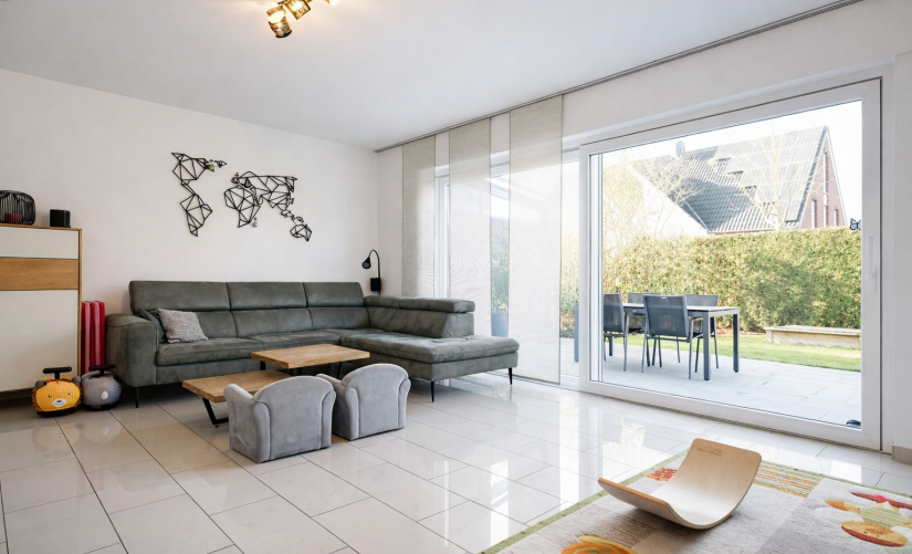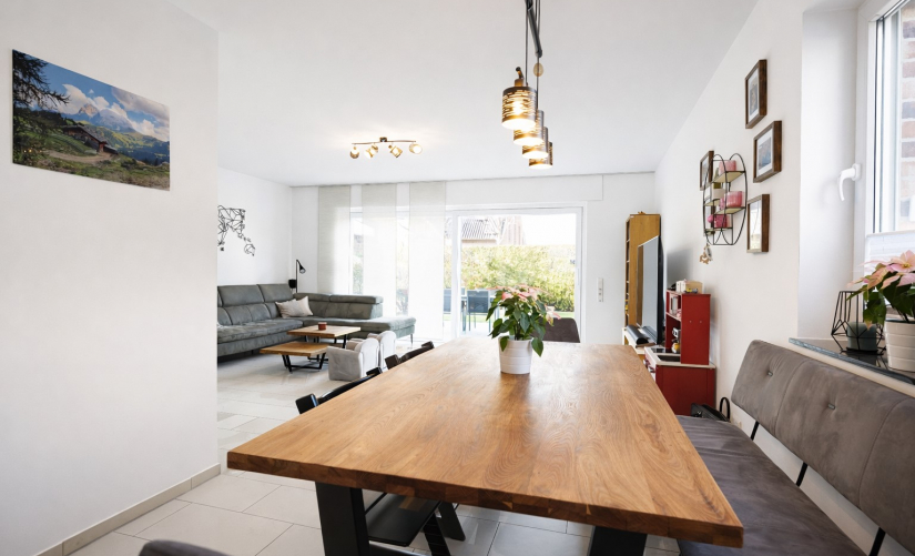 Die Wohnfläche ist hervorragend aufgeteilt und schafft eine gelungene Balance zwischen Großzügigkeit und Funktionalität. Besonders einladend ist der offen gestaltete Wohn- und Essbereich mit integrierter Küche, der als zentraler Treffpunkt des Hauses fungiert. Große bodentiefe Schiebetüren öffnen den Raum zum hübsch gestalteten Garten mit großzügiger Sonnenterrasse und sorgen zugleich für ein lichtdurchflutetes Ambiente. Hier genießen Sie entspannte Stunden im Freien und einen harmonischen Übergang zwischen Innen- und Außenbereich – ein kleines privates Gartenparadies in ruhiger, gewachsener Nachbarschaft.