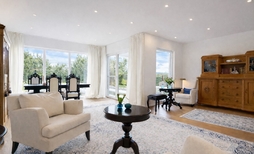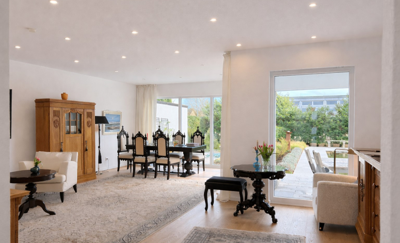 Ein weitläufiger Eingangsbereich empfängt Sie hell und freundlich. Herzstück des Hauses ist der großzügige Wohn- und Essbereich mit zahlreichen bodentiefen Fensterelementen, die für eine lichtdurchflutete Atmosphäre sorgen und den direkten Zugang zur Sonnenterrasse sowie in den liebevoll angelegten Garten ermöglichen.