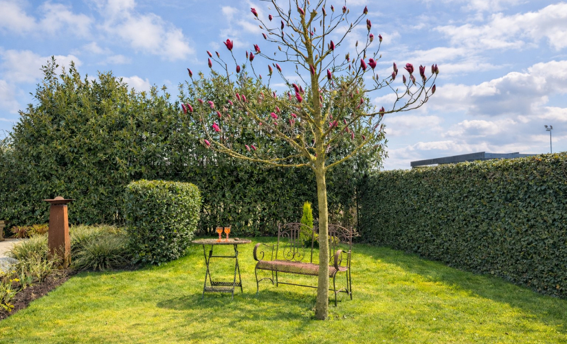 Weiße Rosen und üppiger Lavendel rahmen das Wasser harmonisch ein und setzen in den Frühlings- und Sommermonaten eindrucksvolle Farbakzente. Dicht gewachsene Hecken sorgen ganzjährig für ein hohes Maß an Privatsphäre. Mehrere liebevoll arrangierte Sitzplätze – ob auf der großzügigen Sonnenterrasse oder im hinteren Gartenbereich mit Blick über das Wasser – laden zum Verweilen ein. Darüber hinaus steht Ihnen ein weiteres, vollwertiges Badezimmer mit bodentiefer Dusche zur Verfügung, das praktischerweise direkt vom Garten aus zugänglich ist – ideal nach der Gartenarbeit oder an warmen Sommertagen.