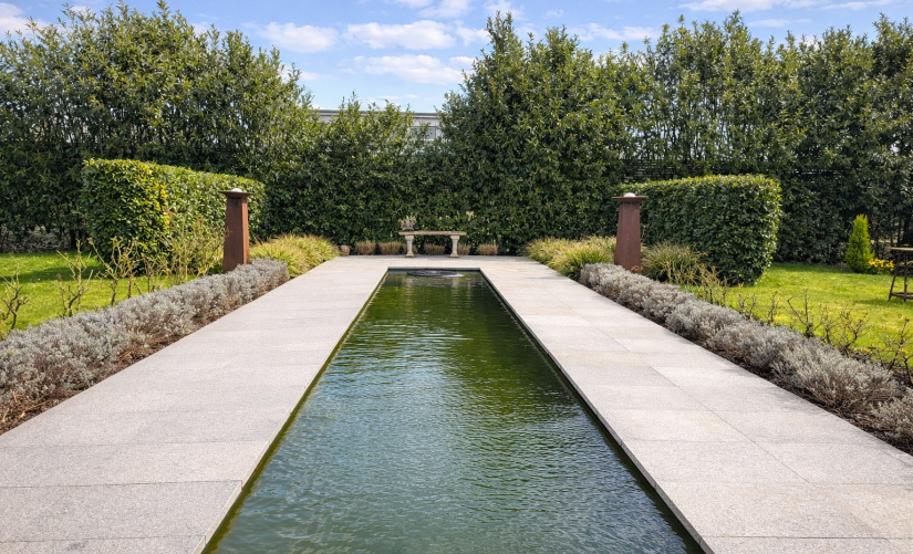 Der stilvoll angelegte Garten bildet ein weiteres Highlight der Immobilie. Er überzeugt durch klare Linien und eine hochwertige Gestaltung. Mittelpunkt ist das elegant eingefasste, rechteckige Wasserbecken, das dem Außenbereich eine besondere Ruhe und Eleganz verleiht. Großzügige Natursteinflächen unterstreichen die moderne, aufgeräumte Anmutung.