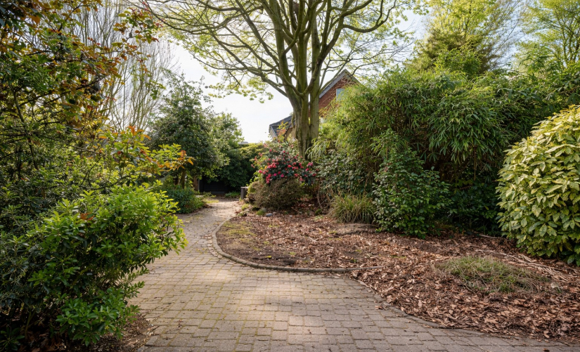 Angrenzend befindet sich die Küche mit direkter Verbindung zum lichtdurchfluteten Wintergarten. Dieser erweitert den Wohnraum auf elegante Weise und schafft einen fließenden Übergang zwischen Innen- und Außenbereich. Von hier aus gelangt man auf die Terrasse und in den Garten, der sich als hübsche grüne Oase mit gewachsenem Baumbestand und geschützten Rückzugsbereichen präsentiert. Die Grundstücksgröße bietet dabei ein ausgewogenes Verhältnis zwischen Pflegeaufwand und Nutzbarkeit.