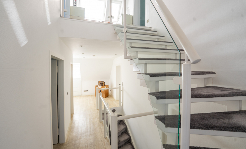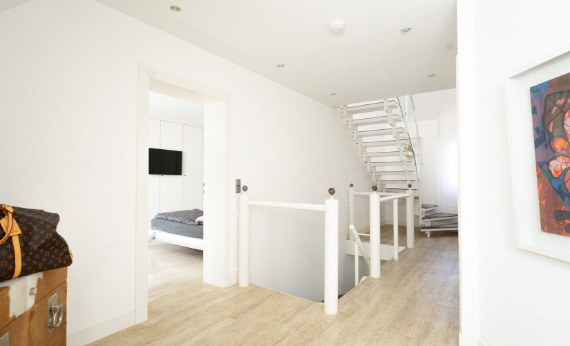 Bereits beim Betreten des Hauses wird die besondere Atmosphäre spürbar: Lichtdurchflutete Räume, eine durchdachte Split-Level-Architektur im Erdgeschoss sowie ein harmonisches Farbkonzept in Weiß- und Cremetönen schaffen ein modernes und zugleich einladendes Wohngefühl. Verschiedene Wohnbereiche gehen fließend ineinander über und bieten somit vielseitige Nutzungsmöglichkeiten – ob als gemütlicher Rückzugsort, stilvoller Empfangsbereich oder offener Lebensmittelpunkt. Das Erdgeschoss wird durch eine zeitlose, offen gestaltete Küche, große Fensterfronten zum Garten hin und einem modernisierten Gäste-WC ergänzt.