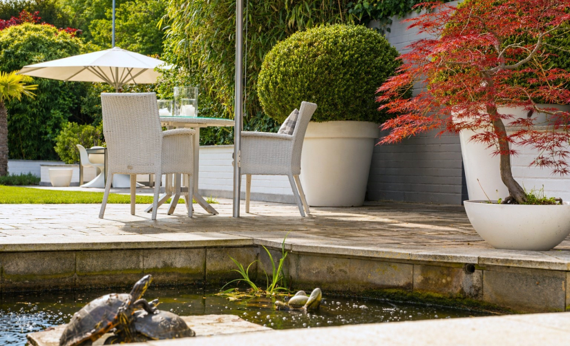 Der Außenbereich ist ein echtes Highlight dieser Immobilie: Der liebevoll gestaltete Garten bietet mehrere gemütliche Sitzecken, die zum Verweilen einladen, einen gradlinig angelegten Teich sowie ein charmant gemauerter Sitzbereich mit integrierter Outdoorküche und Kamin – perfekt für gesellige Abende mit Familie und Freunden, auch an den kälteren Abenden.